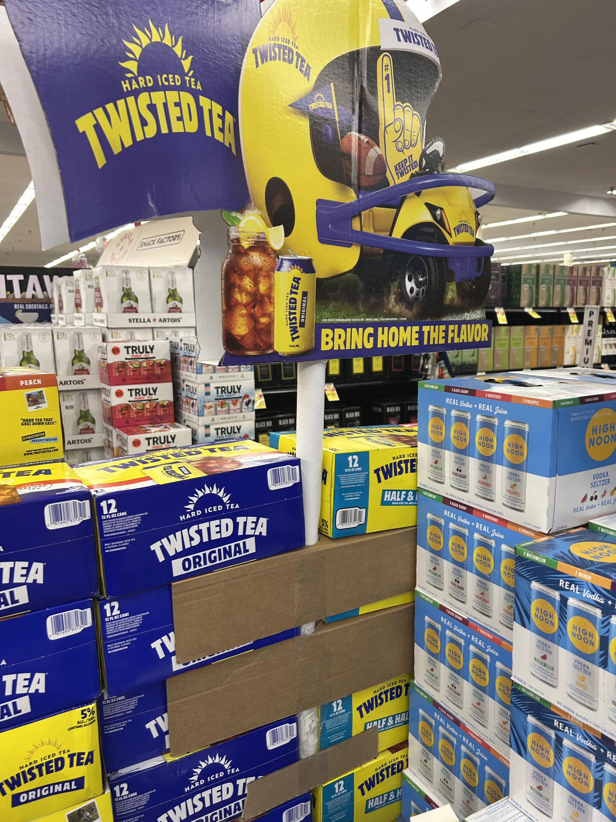 This Twisted Tea pole topper display was McGyvered with 2 DSC pads and another piece one the bottom—keeping it secure, shoppable, and even snug up against another display.